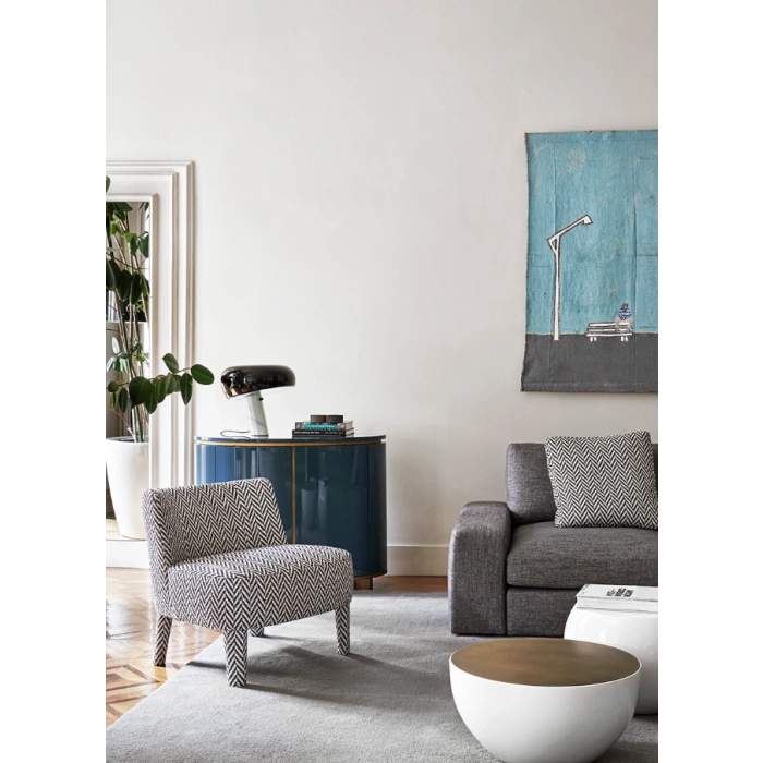 Isabelle è una poltrona di grande versatilità, il suo design moderno ed eleganti infatti la rende adatta sia in ambiti domestici che contract, per un complemento comodo e dall'estetica raffinata. La scocca in legno e metallo è imbottita da poliuretano e fibra di poliestere, il tutto rivestito da un'accurata selezione di tessuti e pelli.